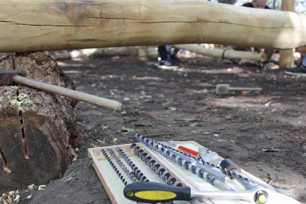 Robinienholz (geschälte Stämme), Japansäge, Forstner, Holzbohrer, Schlangenbohrer, Stechbeitel, Klüpfel, Gewindestangen, Betonfix, Schleifpapier, Motorsäge