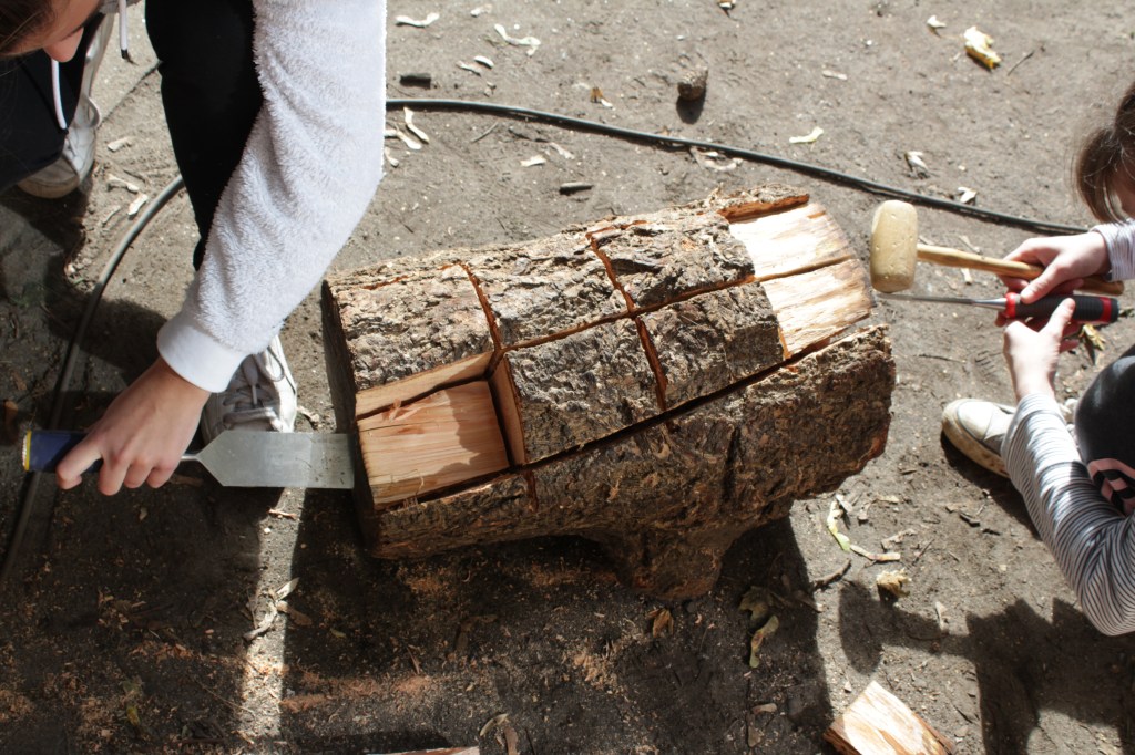 Andere kümmern sich um Beete, die das Grüne Klassenzimmer verschönern sollen. Mit Stechbeitel, Klüpfel und Axt werden kleine Baumstämme ausgekeilt und mit Erde und Pflanzen befüllt. In einem Klassenzimmer braucht es natürlich eine Tafel. Genau wie die Sitzbalken, werden auch die beiden Stämme einbetoniert und anschließend eine Siebdruckplatte angeschraubt, die dann noch mit Tafelfarbe angestrichen wird und einsatzbereit ist.