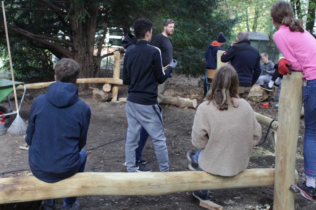 Die Erde fliegt und die Löcher erreichen bald die gewünschte Tiefe. Das Grundgerüst kann nun einbetonieret werden. Sechs Stämme werden von den Schülern und Schülerinnen selbstständig einbetoniert, mit der Wasserwaage auf die richtige Position gebracht und sich stolz angeschaut.