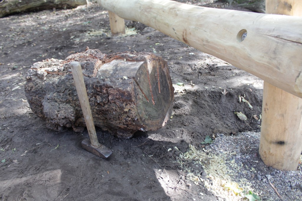 Mit Stechbeitel und Klüpfel werden die Robinienstämme zunächst abgerundet und mit Schleifpapier geschliffen.