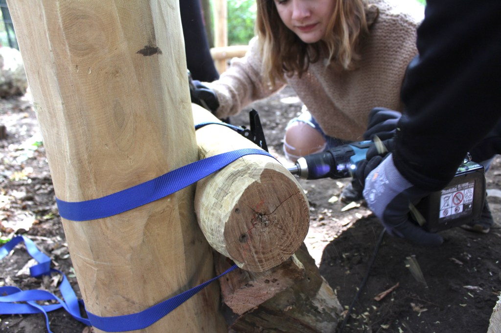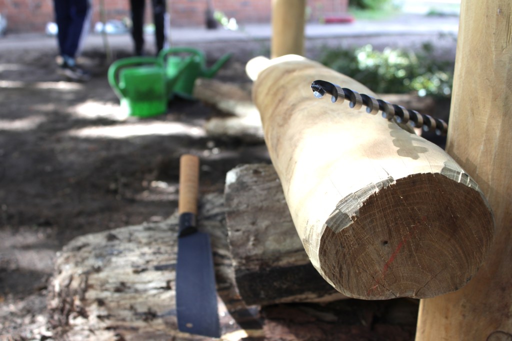 Die nächsten Tage werden mit dem Auskeilen der Stämme zugebracht. Jede Gruppe hat die Verantwortung für einen Stamm. Nach einigen Korrekturen können die ersten Bohrungen vorgenommen werden. Dies bedeutet Gruppenarbeit. Nachdem Forstnerbohrer und Schlangenbohrer zum Einsatz gekommen sind, werden die Stämme mit Gewindestangen festgeschraubt.